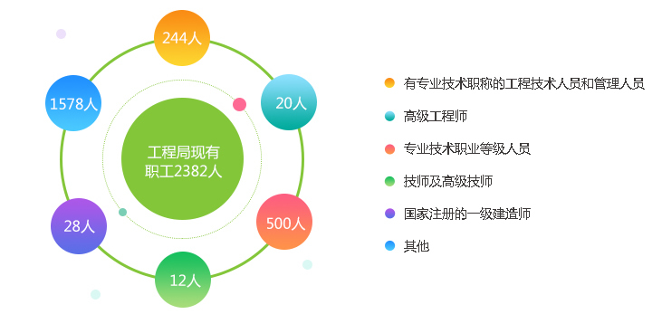 現有職工2382人,有專業技術職稱的工程技術人員和管理人員244人,其中,高級工程師20人,專業技術職業等級人員500人,其中,技師及高級技師12人,國家注冊的一級建造師28人,其他人員1578人。